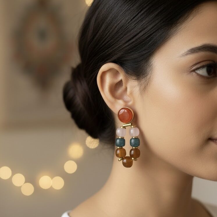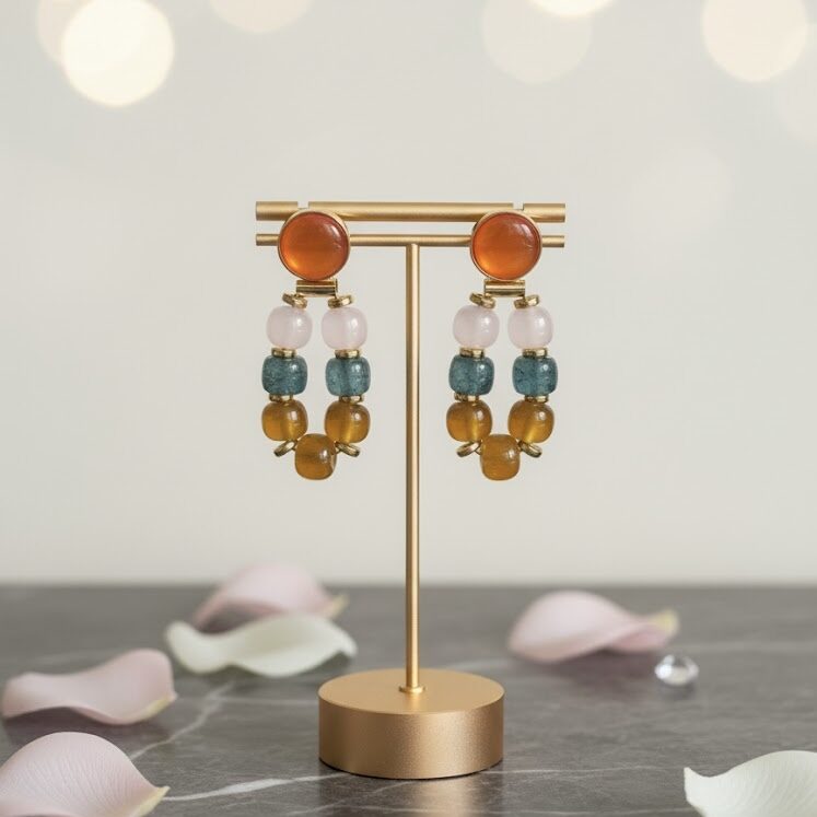 Suspended from the stud is a distinctive U-shaped or “horseshoe” drop, crafted from matte gold-finished hardware. This frame holds a curated gradient of polished gemstone beads, including: