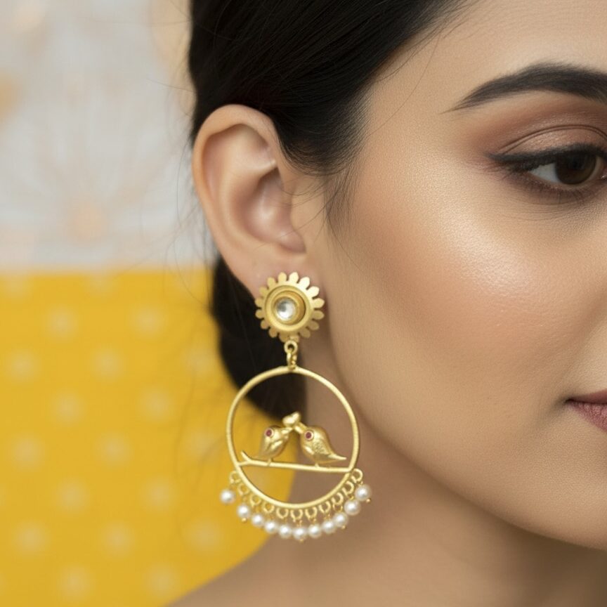 Whimsical Motif: Elegant golden hoops featuring a pair of kissing birds perched delicately on a branch.