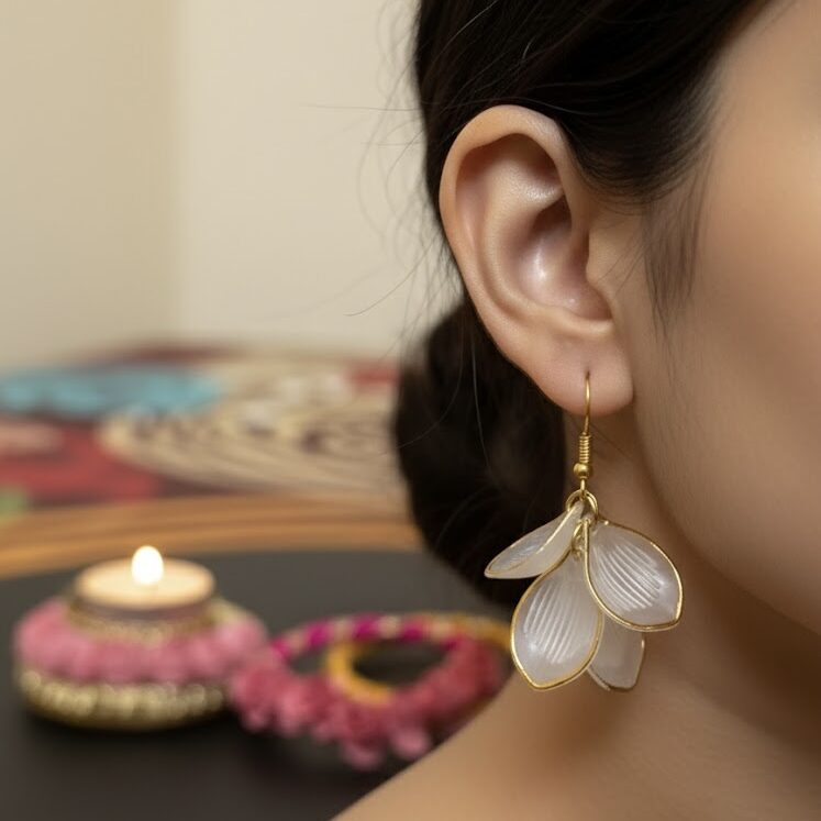 The tiered arrangement of the petals creates a subtle three-dimensional effect, resembling a flower in mid-bloom. Suspended from a classic gold-finished fishhook wire, these earrings provide a secure fit and a gentle sway with every movement. Whether you are dressing up for a wedding, a cultural festival, or a romantic dinner, these lightweight floral drops add a touch of poetic elegance to any outfit.