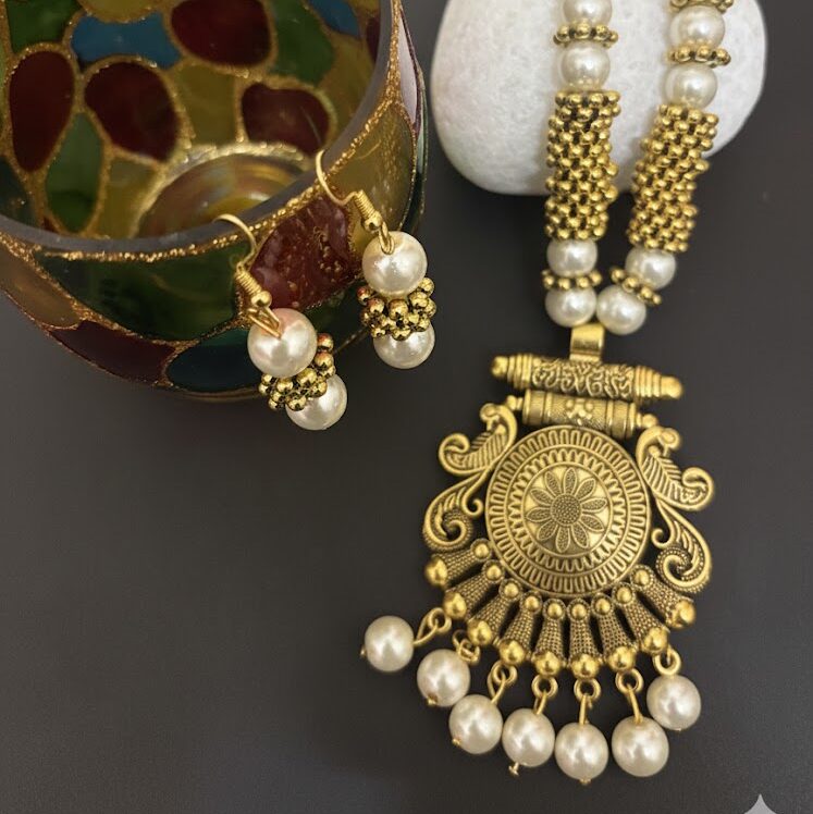 Unique Chain Detail: Moving away from standard chains, the Noorika features a sophisticated strand that alternates between thick sections of woven antique-gold micro-beads and perfectly spaced cream-colored pearls. This textural contrast ensures the piece stands out from every angle.