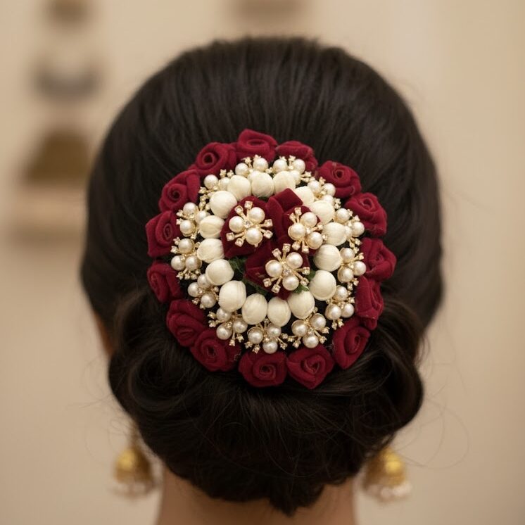 The Ishvarya Rose Bun Accessory is a masterpiece of traditional craftsmanship, designed to bring regal elegance to your hair. This circular hair piece (Juda cover) features a vibrant border of miniature velvet roses in a rich maroon hue. The center is intricately adorned with delicate ivory fabric buds and shimmering pearl clusters set in gold-toned floral motifs.