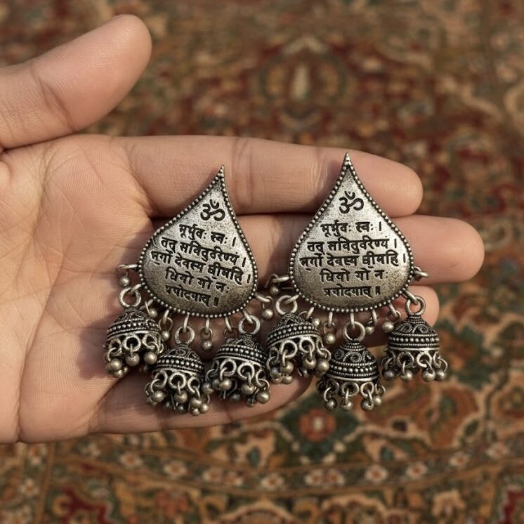 A pair of striking oxidized silver teardrop earrings that blend spiritual significance with traditional craftsmanship. The central teardrop-shaped studs are engraved with the Om symbol and the Gayatri Mantra in Sanskrit script. The bottom of each earring is adorned with multiple miniature Jhumka bells, creating a rich, fringed effect that adds movement and a “chime” quality to the design.